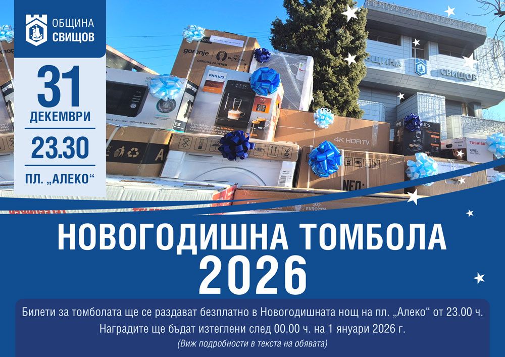 Билетите за томболата ще бъдат раздавани безплатно от 23:00 ч. пред Коледната къщичка на централния площад "Алеко", в Свищов. Печелившите номера ще бъдат изтеглени отново на площада в първите минути на 2026 година.