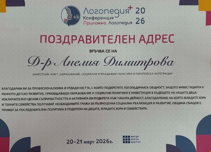 В рамките на конференцията присъстваха представители на ръководството на Община Свищов – д-р Анелия Димитрова, заместник-кмет, и г-жа Анелия Димитрова, ръководител на Общинска служба „Социални дейности“. По време на събитието на д-р Анелия Димитрова бе връчен специален поздравителен адрес от организаторите, с който бе изразена признателност за професионализма и отдадеността, с които общината подкрепя логопедичната общност и дейностите на специалистите. Това признание още веднъж утвърждава Община Свищов като пример за устойчива и последователна политика в подкрепа на децата, младите хора и техните семейства.