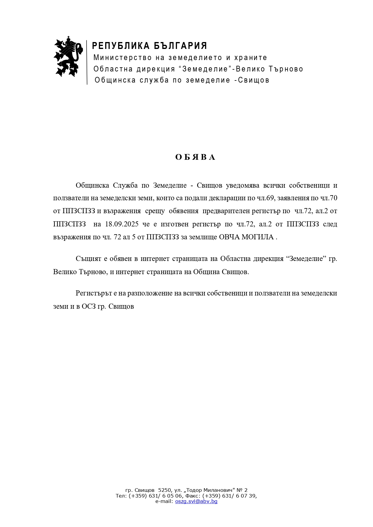 Служба по Земеделие - Свищов уведомява всички собственици и ползватели на земеделски земи, които са подали декларации по чл.69, заявления по чл.70 от ППЗСПЗЗ и възражения срещу обявения предварителен регистър по чл.72, ал.2 от ППЗСПЗЗ на 18.09.2025 че е изготвен регистър по чл.72, ал.2 от ППЗСПЗЗ след възражения по чл. 72 ал 5 от ППЗСПЗЗ за землище ОВЧА МОГИЛА .