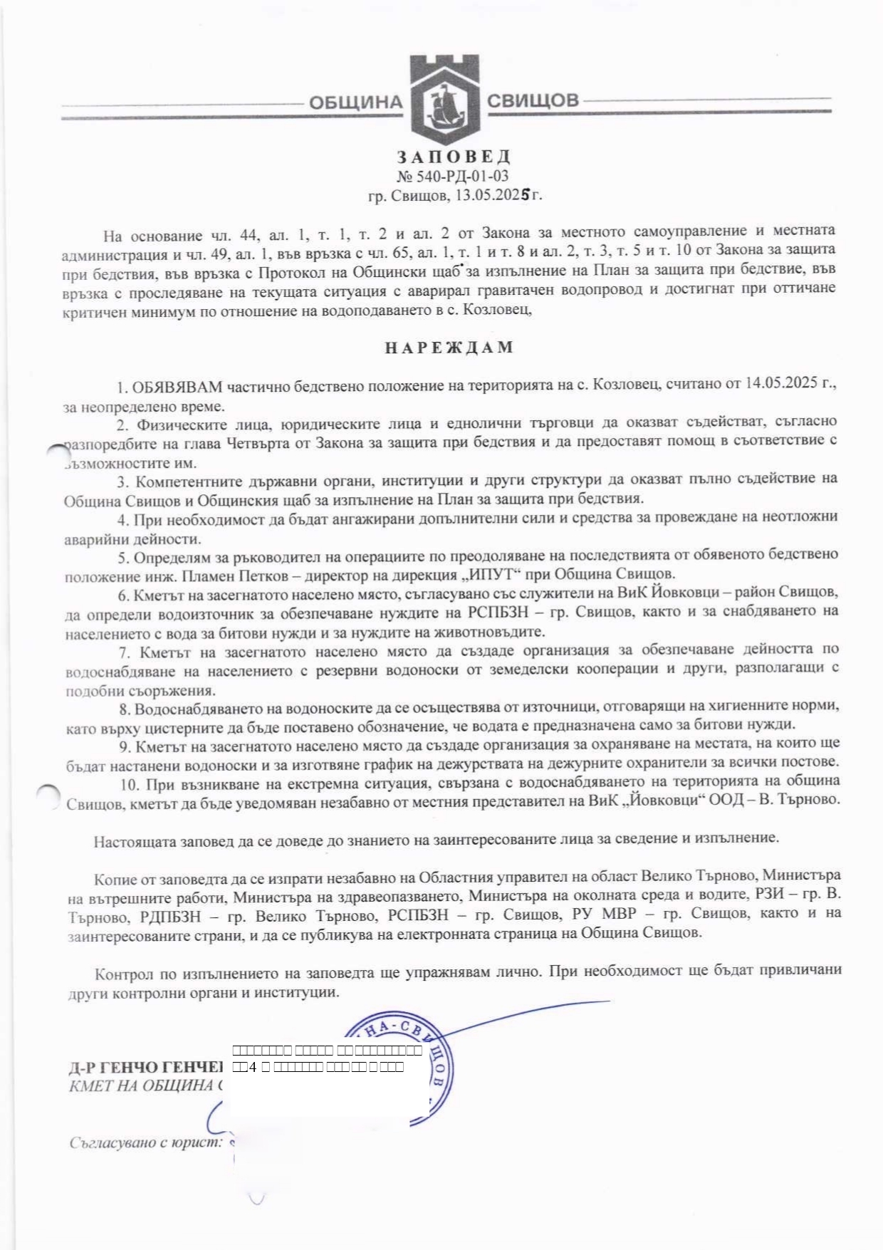 На основание чл. 44, ал. 1, т. 1, т. 2 и ал. 2 от Закона за местното самоуправление и местната администрация и чл. 49, ал. 1, във връзка с чл. 65, ал. 1, т. 1 и т. 8 и ал. 2, т. 3, т. 5 и т. 10 от Закона за защита при бедствия, във връзка с Протокол на Общински щаб за изпълнение на План за защита при бедствие, във връзка с проследяване на текущата ситуация с аварирал гравитачен водопровод и достигнат при оттичане критичен минимум по отношение на водоподаването в с. Козловец,