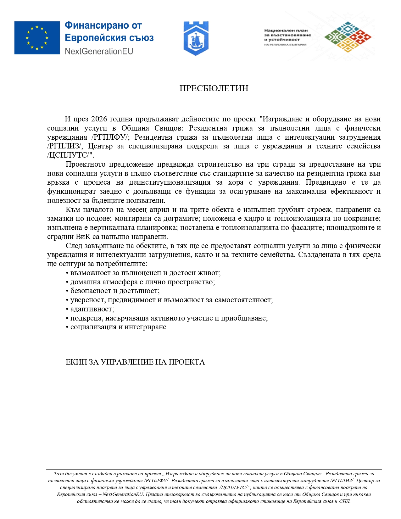 И през 2026 година продължават дейностите по проект "Изграждане и оборудване на нови социални услуги в Община Свищов: Резидентна грижа за пълнолетни лица с физически увреждания /РГПЛФУ/; Резидентна грижа за пълнолетни лица с интелектуални затруднения /РГПЛИЗ/; Център за специализирана подкрепа за лица с увреждания и техните семейства  /ЦСПЛУТС/".