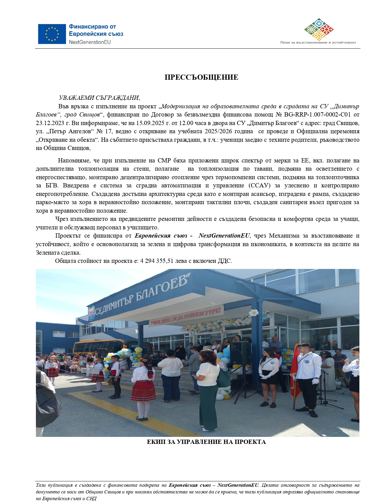 Във връзка с изпълнение на проект „Модернизация на образователната среда в сградата на СУ „Димитър Благоев“, град Свищов“, финансиран по Договор за безвъзмездна финансова помощ № BG-RRP-1.007-0002-C01 от 23.12.2023 г. Ви информираме, че на 15.09.2025 г. от 12.00 часа в двора на СУ „Димитър Благоев“ с адрес: град Свищов, ул. „Петър Ангелов“ № 17, ведно с откриване на учебната 2025/2026 година се проведе и Официална церемония „Откриване на обекта“. На събитието присъстваха граждани, в т.ч.: ученици заедно с техните родители, ръководството на Община Свищов,