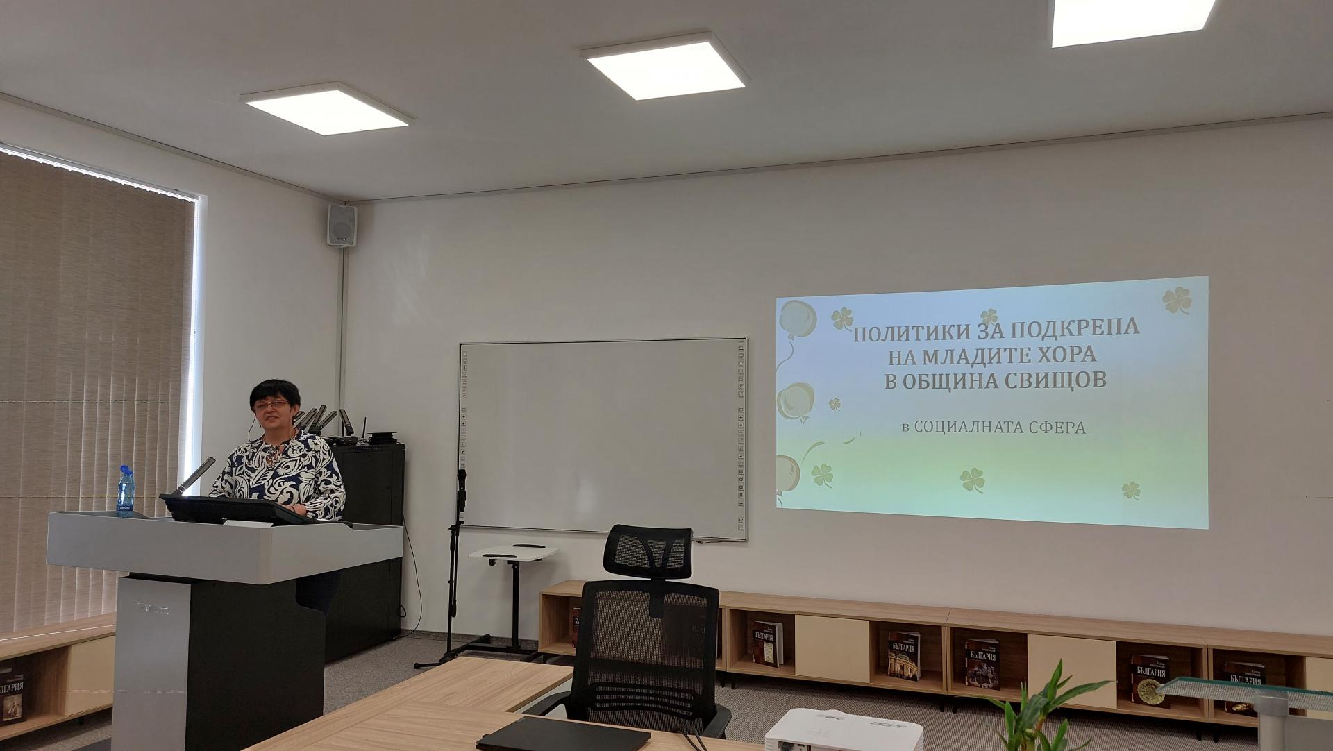 Ръководителят на ОС "Социални дейности" към община Свищов Анелия Димитрова направи презентация, в която показа различните социални услуги, функциониращи активно на територията на общината като подчерта, че в момента 10 млади хора до 29 години се реализират успешно и прилагат знанията, уменията и компетенциите си в дейностите на социалните центрове в Свищов. Тя сподели също, че през 2025 година социална подкрепа са получили 242 деца и млади хора до 18-годишна възраст, а социалните програми, които се реализират  за подобряване условията на живот и труд на младите хора в общината са насочени към – социално включване и подобряване качеството на живот, насърчаване на заетостта и уменията, социална интеграция и адаптация, и преодоляване на социалните различия.
