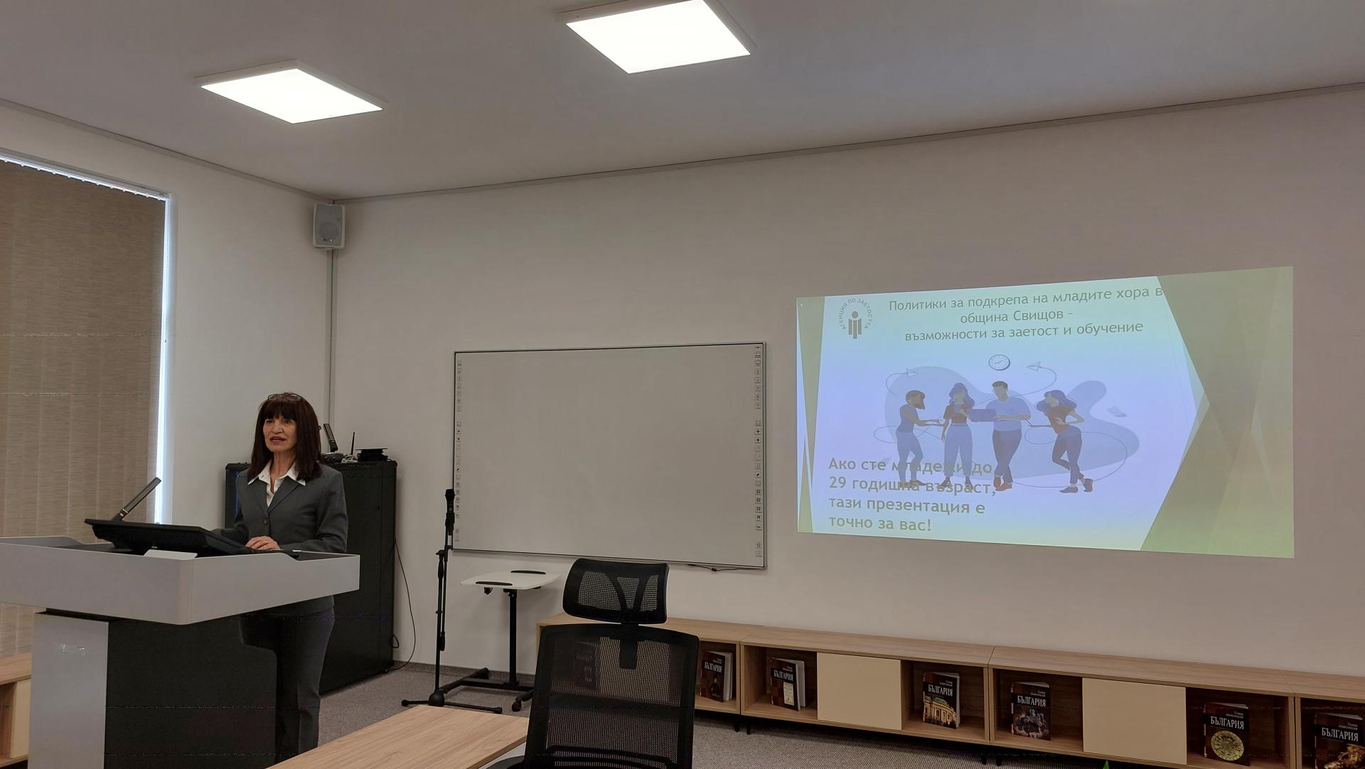 Директорът на Дирекция „Бюро по труда“ Татяна Александрова също представи възможностите, които се предоставят за професионална реализация, адаптация към пазара на труда и подкрепа от Агенцията по заетостта, като акцентира върху реалните възможности за включване на младите хора до 29 години към обучения за допълнителна квалификация, младежка заетост и стажове. Тя обърна внимание на активния в момента проект "Младежка заетост + компонент 2" и възможностите за включване в него на младежи от 16 до 29 години, търсещи работа. Също така тя отбеляза и вариантите за надграждане на знания и умения, които се разкриват чрез съдействието на ДБТ, както и различните видове компетенции – езикови, компютърни и др., които могат да се придобият и да окажат благоприятно влияние за професионалното развитие на младите хора.