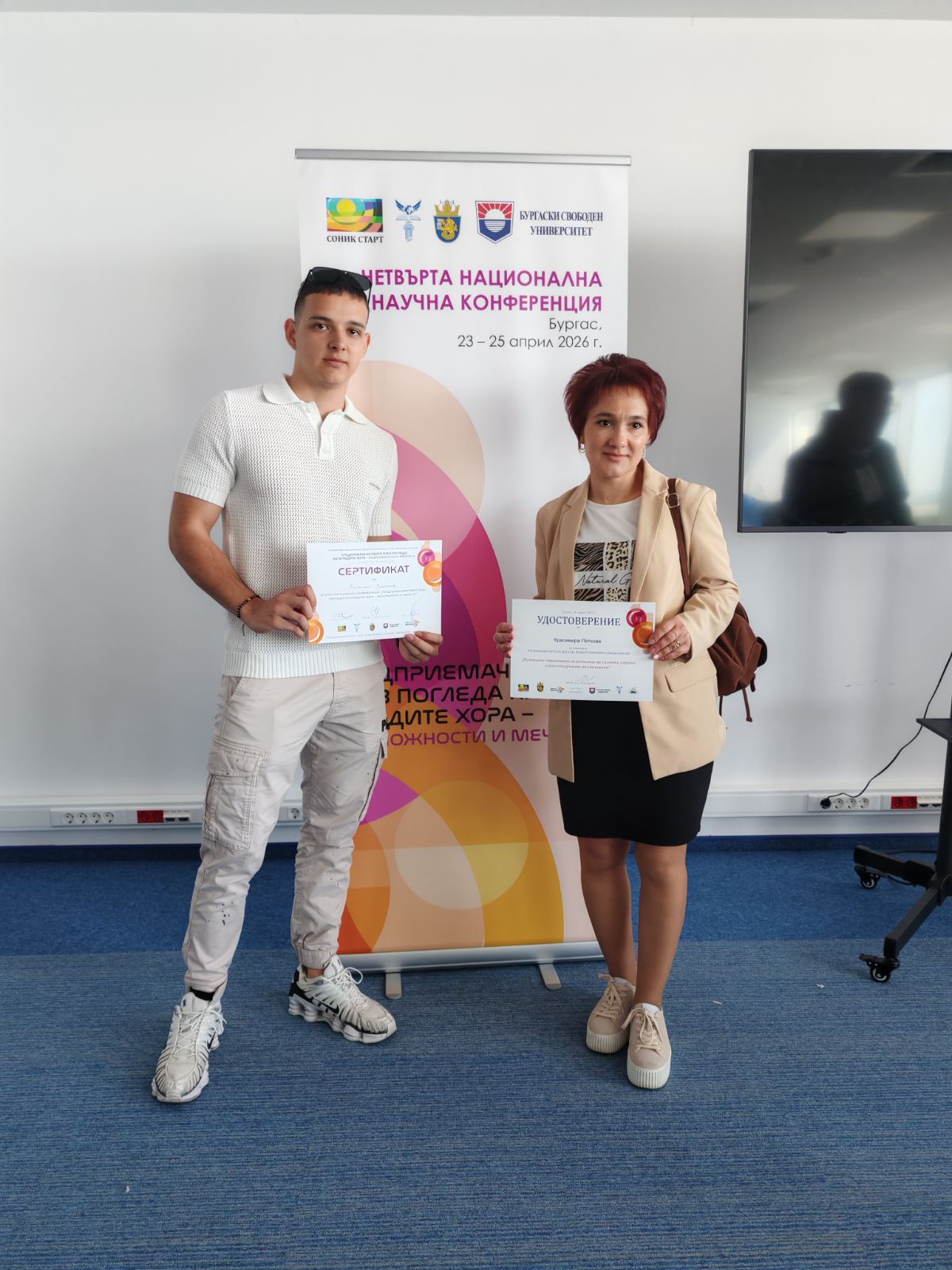 Ученик и преподавател от ПДТГ „Димитър Хадживасилев“ представиха успешно иновативен проект в рамките на Четвъртата национална научна конференция „Предприемачеството през погледа на младите хора – възможности и мечти IV“, проведена в периода 23–25 април 2026 г. в Бургас.
