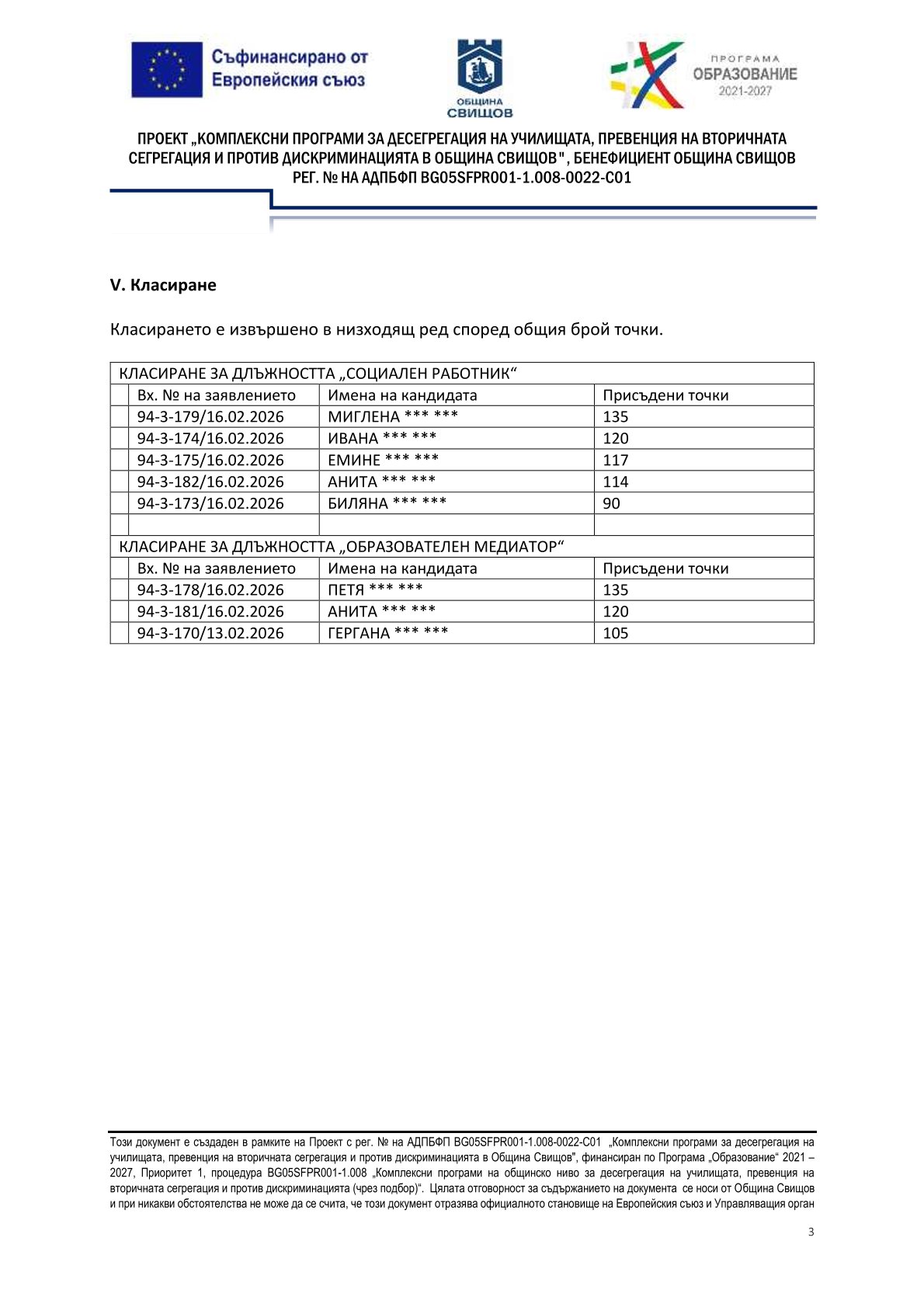 РЕЗУЛТАТИ ОТ ПРОВЕДЕНА ПРОЦЕДУРА ЗА ПОДБОР НА ПЕРСОНАЛ ЗА ИЗПЪЛНЕНИЕ НА ПРОЕКТНИ ДЕЙНОСТИ В ИЗПЪЛНЕНИЕ НА ПРОЕКТ „КОМПЛЕКСНИ ПРОГРАМИ ЗА ДЕСЕГРЕГАЦИЯ НА УЧИЛИЩАТА, ПРЕВЕНЦИЯ НА ВТОРИЧНАТА СЕГРЕГАЦИЯ И ПРОТИВ ДИСКРИМИНАЦИЯТА В ОБЩИНА СВИЩОВ", АДПБФП С РЕГ. № BG05SFPR001-1.008-0022-C01
