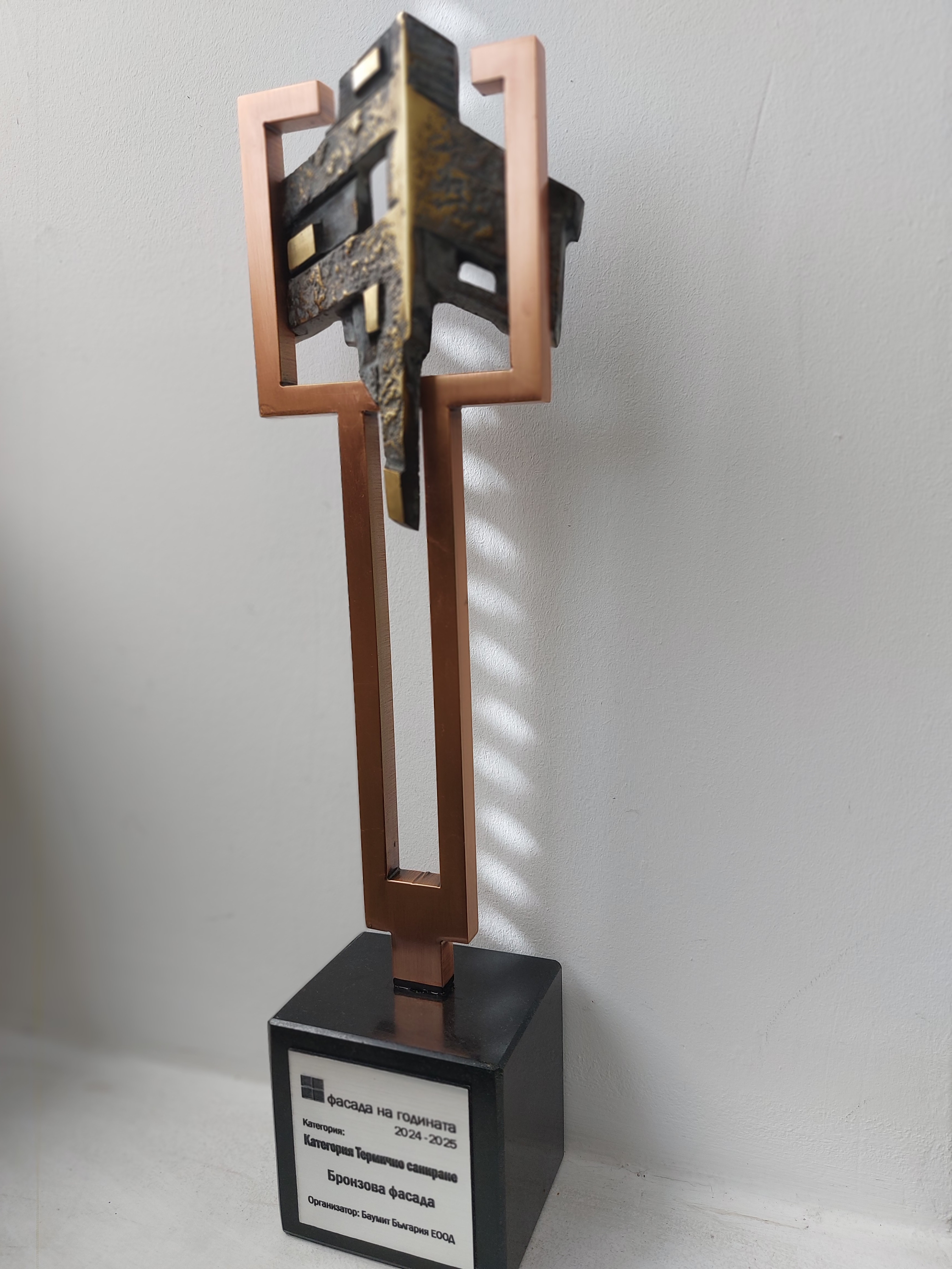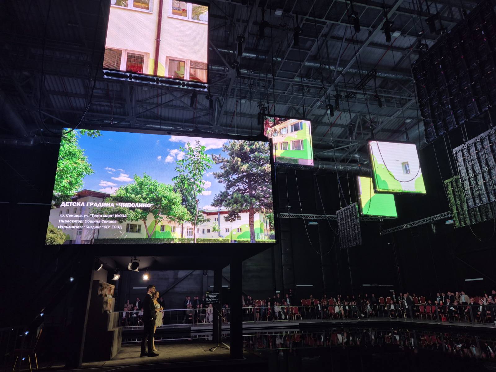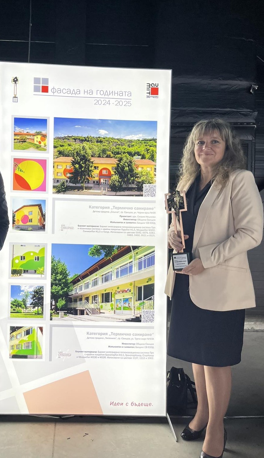 В конкурса, чиято цел е да отличи онези обекти, които съчетават визията на архитектите с висококачествени материали и майсторска изработка, бе номинирана ДГ "Чиполино" в гр. Свищов, която през изминалата година беше преобразена с изпълнението на проект за енергийна ефективност на сградата. Детската градина беше отличена с "Бронзова фасада", в категория "Термично саниране", а награди бяха връчени на възложителя, който е Община Свищов и фирмата изпълнител. На официална церемония в Киноцентър Бояна отличията бяха получени от секретаря на Общината Любомира Петрова и управителя на фирмата, реализирала проекта.
