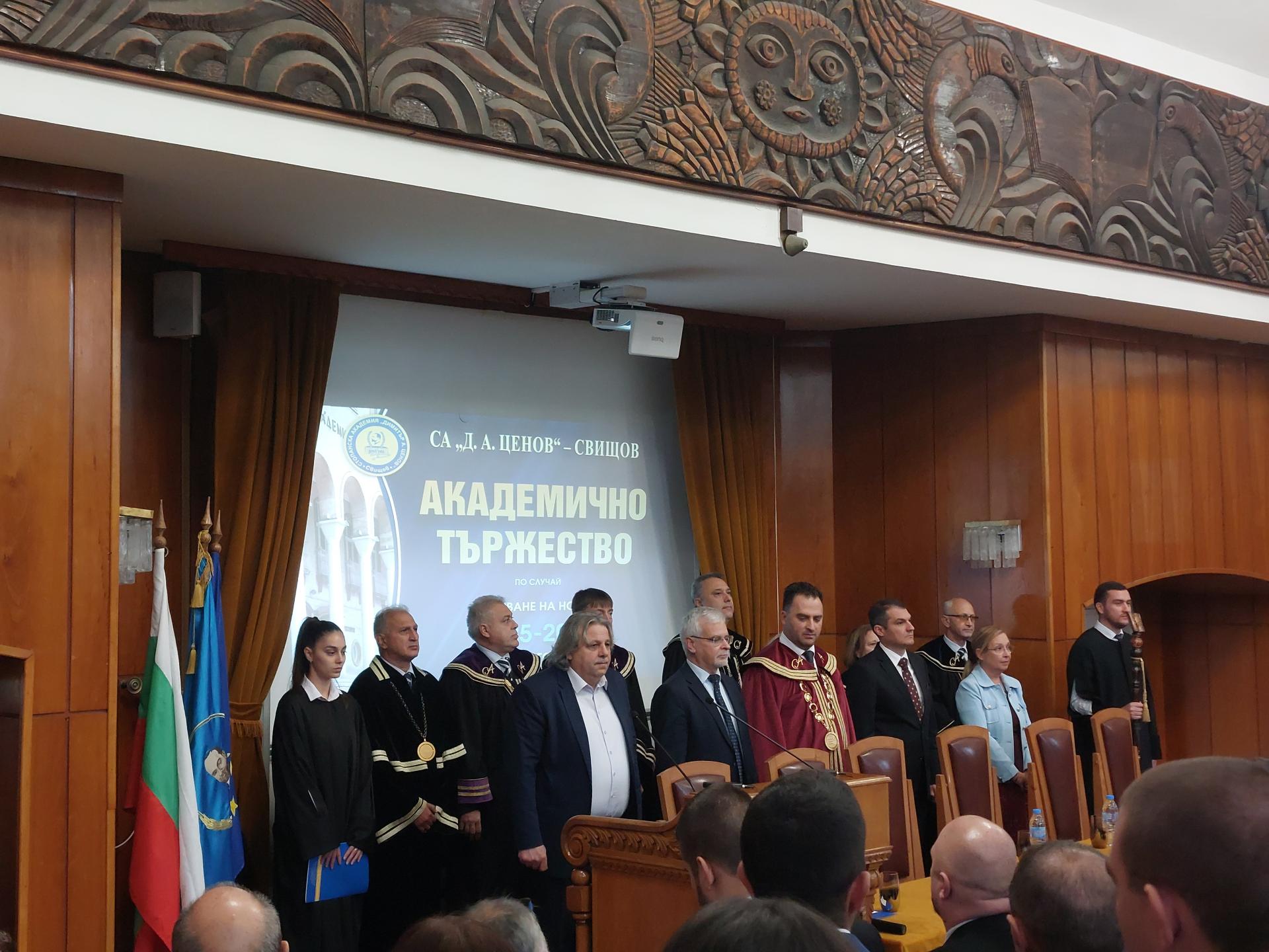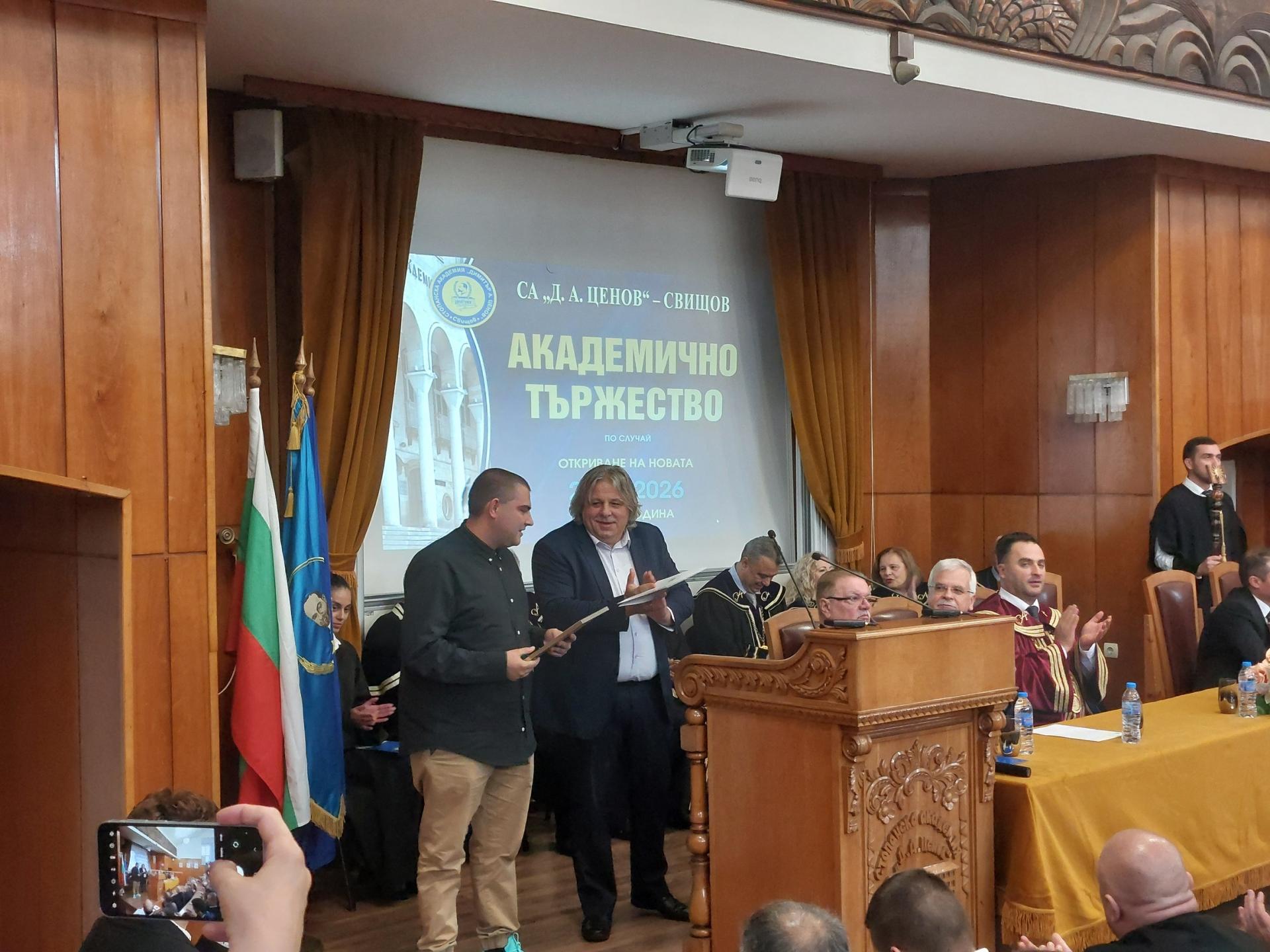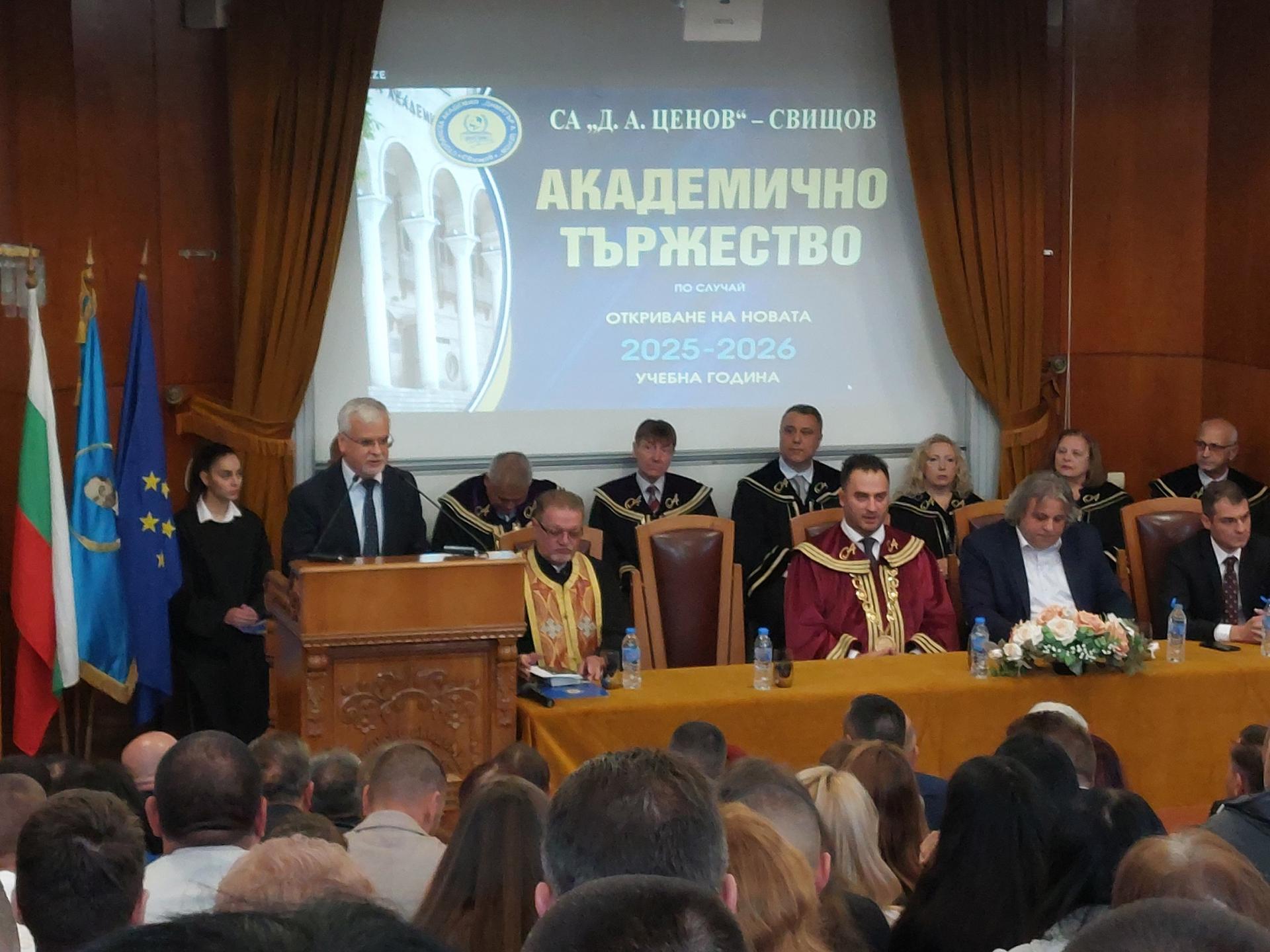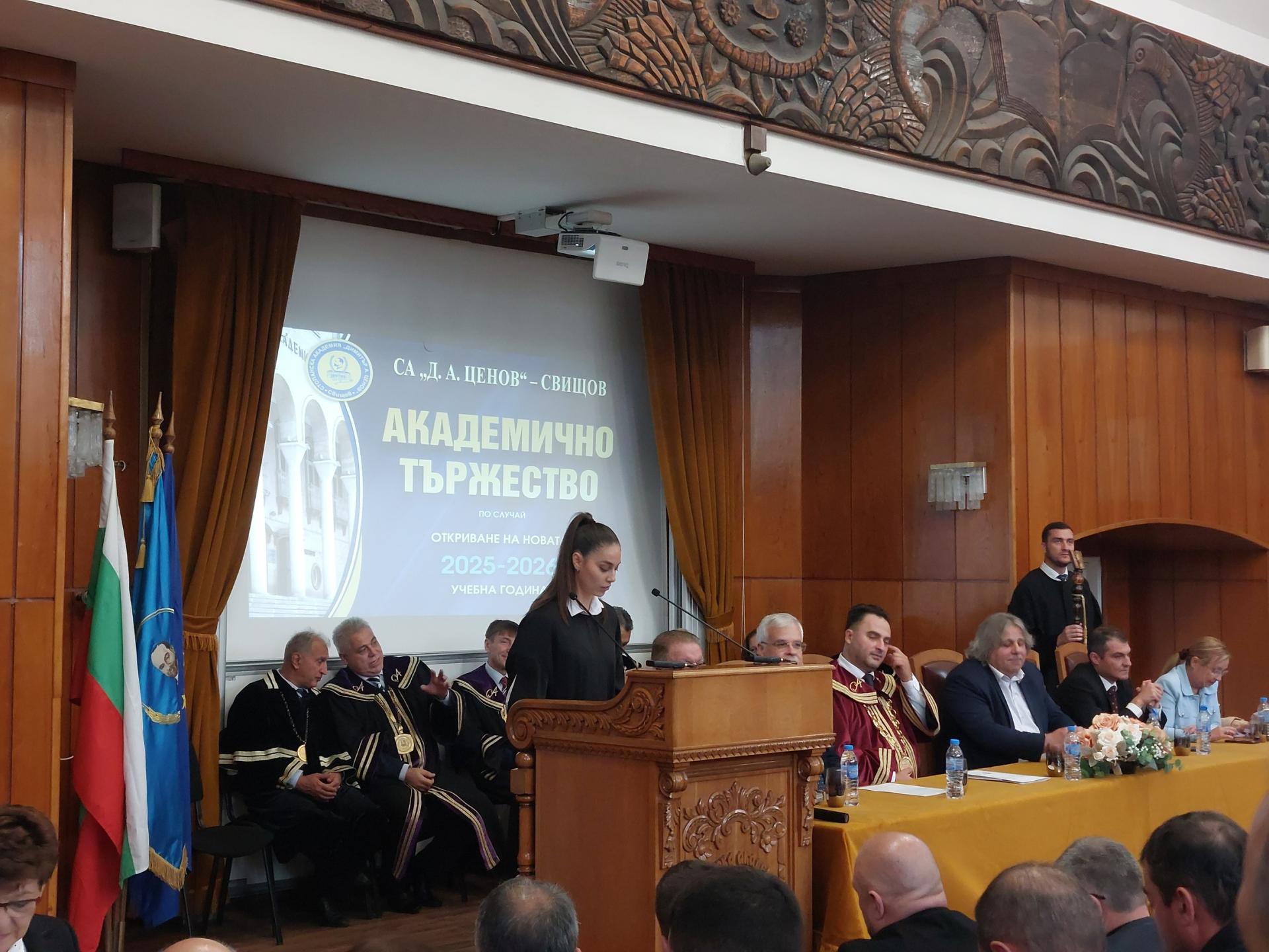 Стопанска академия „Димитър А. Ценов” – гр. Свищов тържествено откри новата академична 2025/2026 година. На юбилейното тържество, което даде старт на 90-тата учебна година в свищовското висше учебно заведение, присъстваха зам.-министърът на образованието и науката акад. Николай Витанов, зам.-министърът на туризма Павлин Петров, председателят на Икономическия и социален съвет Зорница Русинова, председателят на Общински съвет – Свищов д-р Кристиян Кирилов и редица специални гости, сред които и представители на общинското ръководство в лицето на секретаря на община Свищов Любомира Петрова и директора на дирекция "Култура и културно наследство" д-р Росен Маринов.