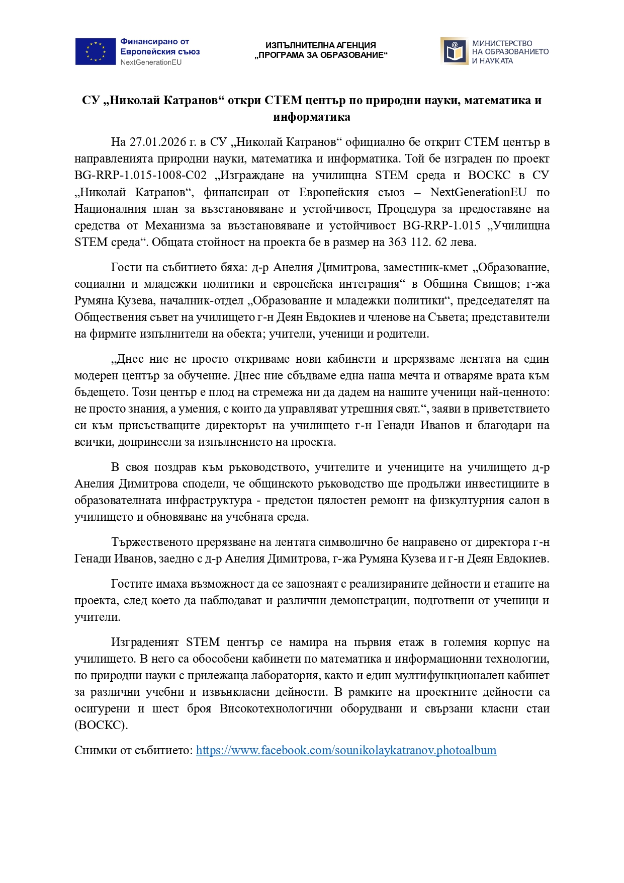 На 27.01.2026 г. в СУ „Николай Катранов“ официално бе открит СТЕМ център в направленията природни науки, математика и информатика. Той бе изграден по проект BG-RRP-1.015-1008-C02 „Изграждане на училищна STEM среда и ВОСКС в СУ „Николай Катранов“, финансиран от Европейския съюз – NextGenerationEU по Националния план за възстановяване и устойчивост, Процедура за предоставяне на средства от Механизма за възстановяване и устойчивост BG-RRP-1.015 „Училищна STEM среда“. Общата стойност на проекта бе в размер на 363 112. 62 лева.