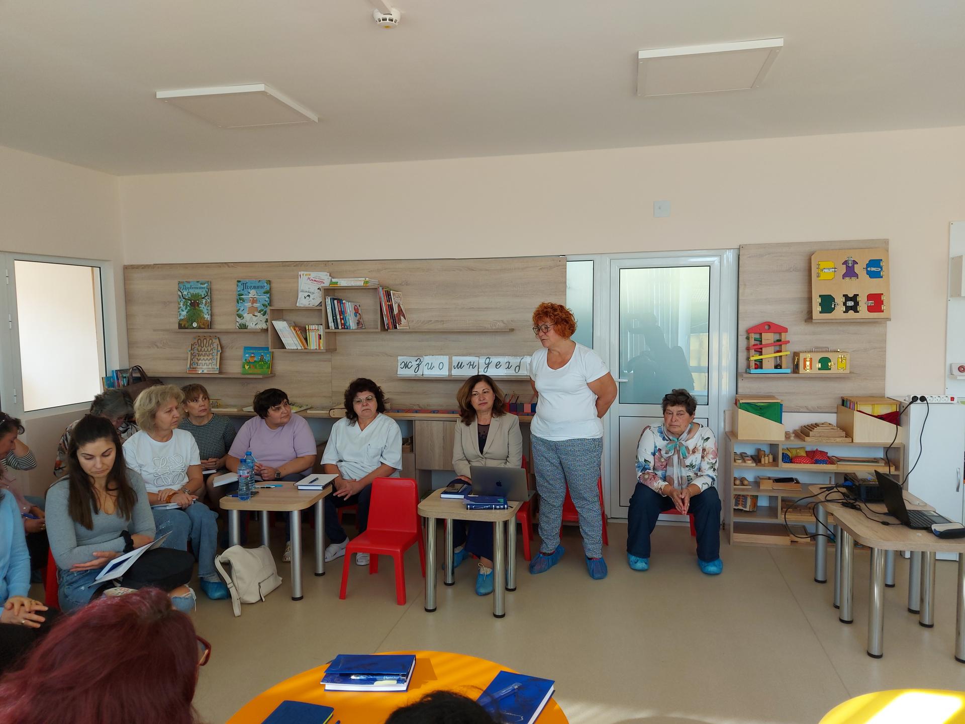 Днес, в ДГ „Васил Левски“, изнесена група на ул. „Плевенско шосе“ №5, се проведе обучение на тема „Цел, задачи и методически насоки на педагогическата практика „Утринна история“. Семинарът е част от реализацията на проект, финансиран по Националната програма „Умения на фокус“, модул 4 „Позитивни нагласи“ и е свързан с апробирането на дейностен психолого-педагогически и методически практико-приложен модел за съвместна работа на педагогически и медицински специалисти в детските ясли. Моделът се апробира в 15 детски градини в България, като тенденцията и нагласите са да се превърне в устойчиво обучение в ранна детска възраст, предвид промените в Закона за предучилищното и училищното образование.